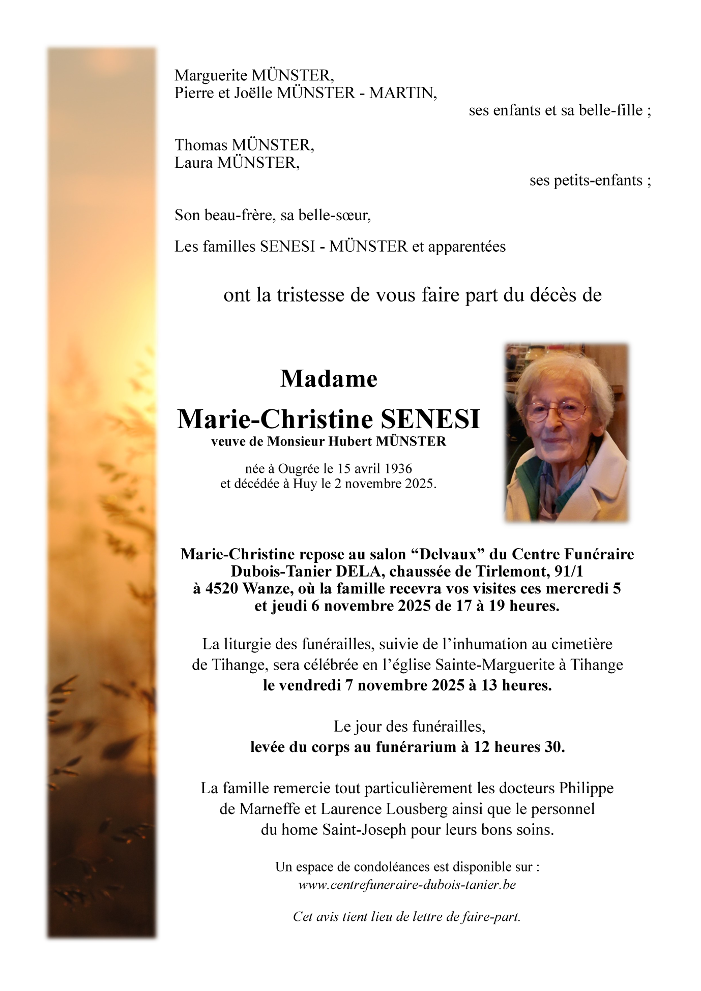 Décédée à Huy (4500) le dimanche 2 novembre 2025 à l'âge de 89 ans