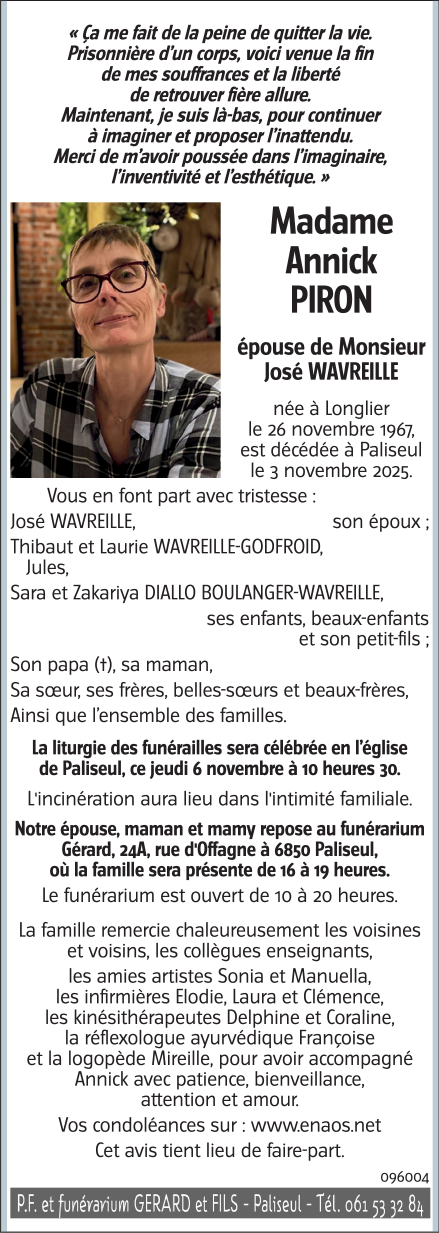 Décédée à Paliseul (6850) le lundi 3 novembre 2025 à l'âge de 57 ans