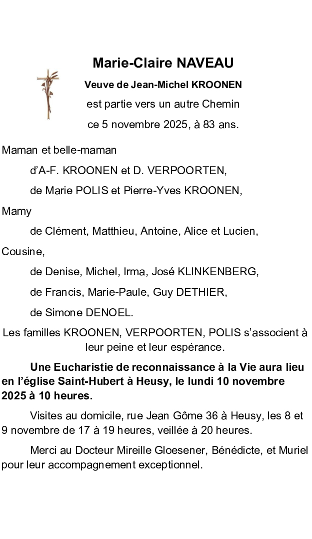 Décédée à Verviers (4800) le mercredi 5 novembre 2025 à l'âge de 83 ans