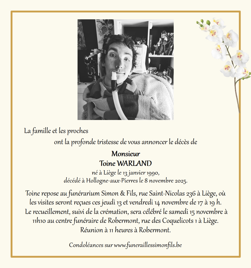 Décédé à Hollogne-aux-Pierres (4460) le samedi 8 novembre 2025 à l'âge de 35 ans