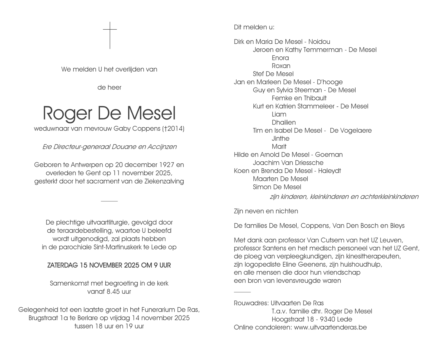 Décédé à Gent (9000) le mardi 11 novembre 2025 à l'âge de 97 ans