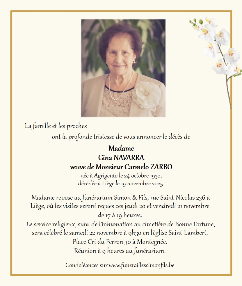 Décédée à Liège (4000) le mercredi 19 novembre 2025 à l'âge de 95 ans