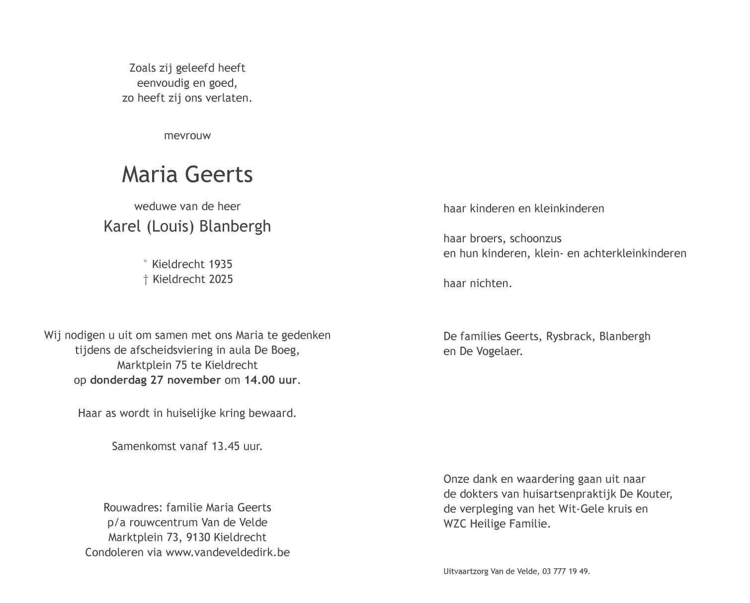 Décédée à Kieldrecht (Beveren) (9130) le jeudi 20 novembre 2025 à l'âge de 90 ans