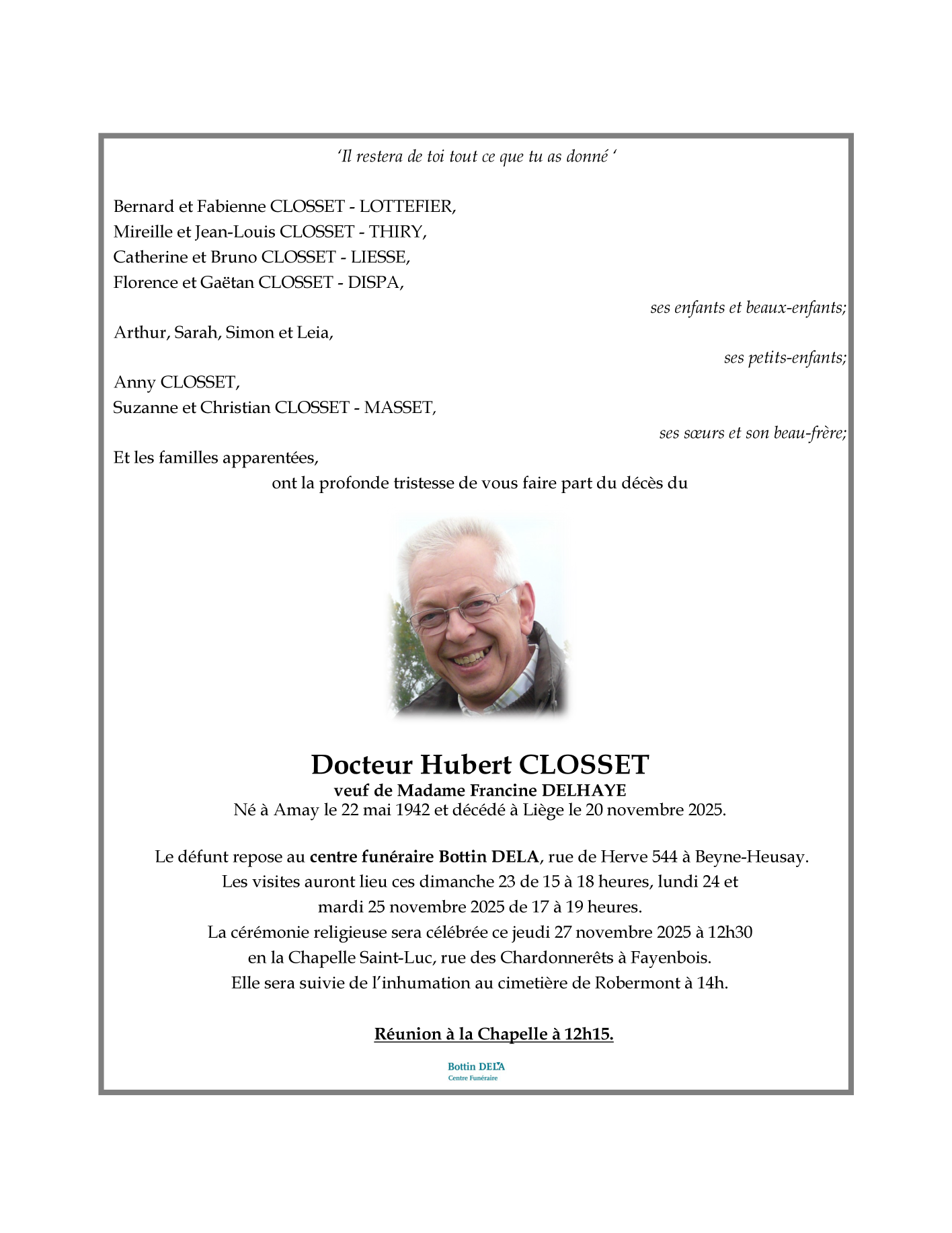 Décédé à Liège (4000) le jeudi 20 novembre 2025 à l'âge de 83 ans