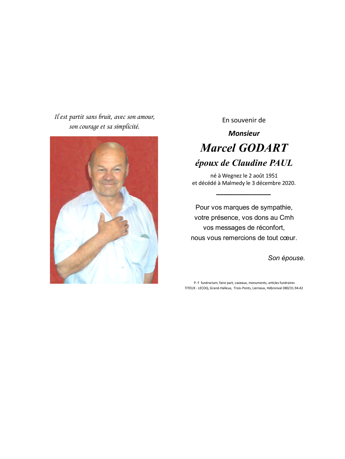 Fallecido en Malmedy (4960) el jueves, 3 de diciembre de 2020 a la edad de 69 años