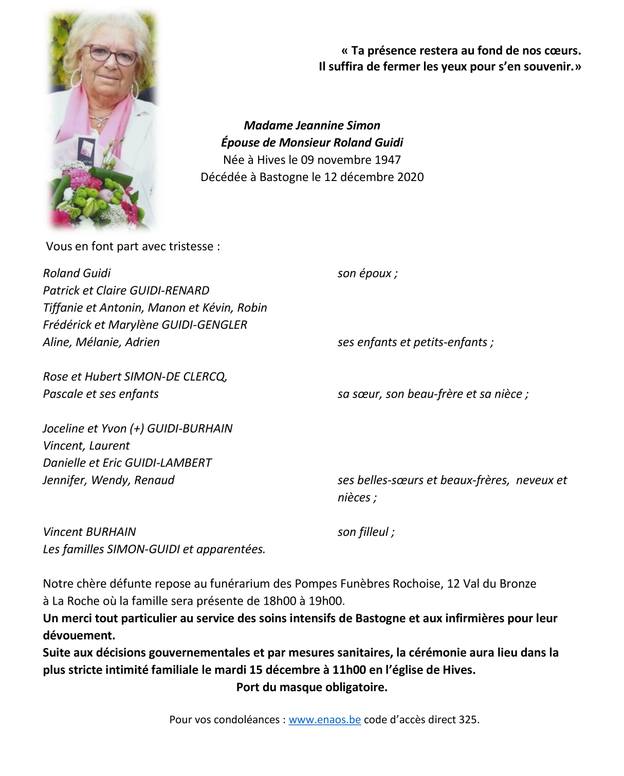 Overleden te Bastogne (6600) op zaterdag 12 december 2020 op 73-jarige leeftijd