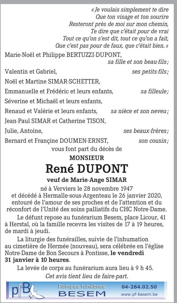 Décédé à Hermalle-sous-Argenteau (4681) le dimanche 26 janvier 2020 à l'âge de 72 ans