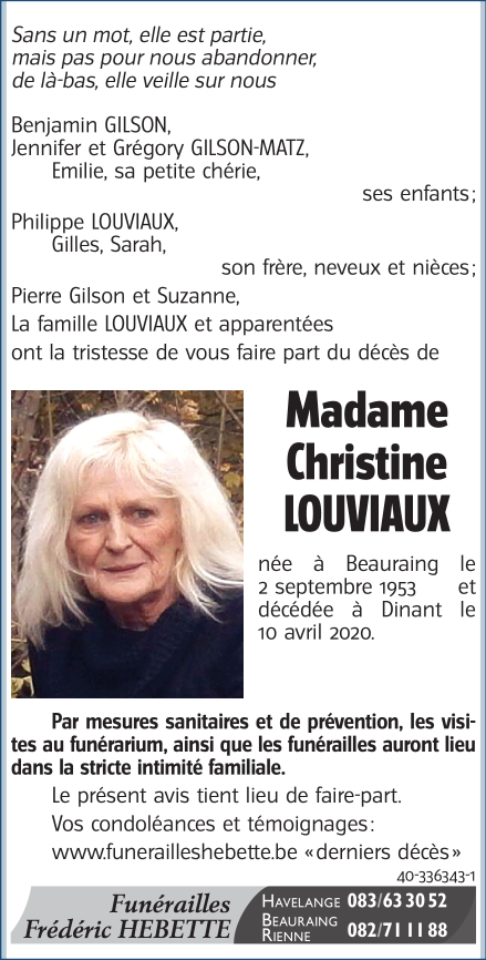 Décédée à Dinant (5500) le vendredi 10 avril 2020 à l'âge de 66 ans