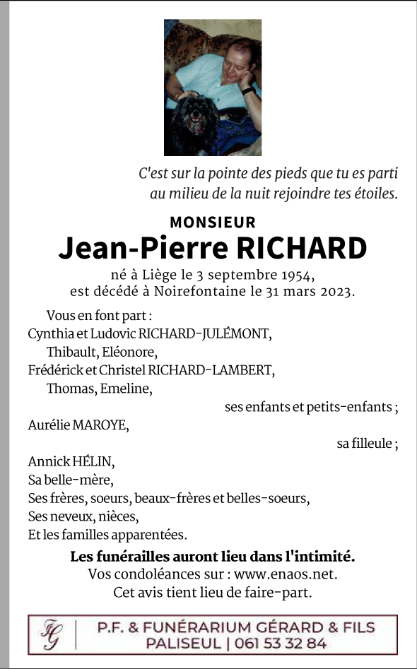 Overleden te Noirefontaine (6831) op zaterdag 1 april 2023 op 68-jarige leeftijd