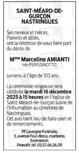 Décédée à Saint-Antoine-de-Breuilh (24230, France) le mardi 9 décembre 2025 à l'âge de 103 ans