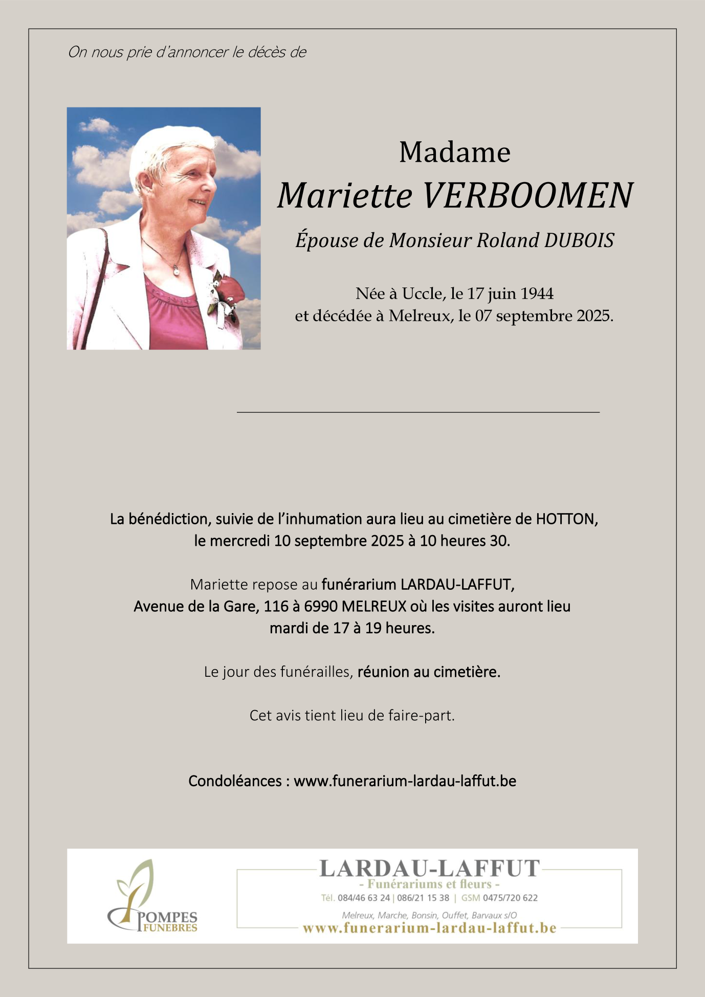 Décédée à Melreux (6990) le dimanche 7 septembre 2025 à l'âge de 81 ans