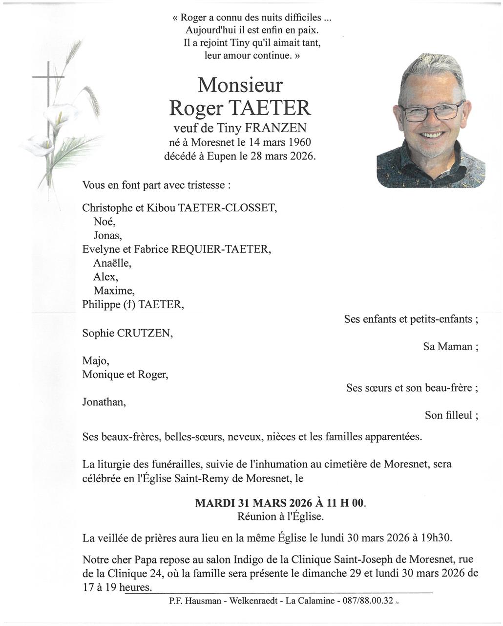 Died in Eupen (4700) on 28 March 2026 at the age of 66 years