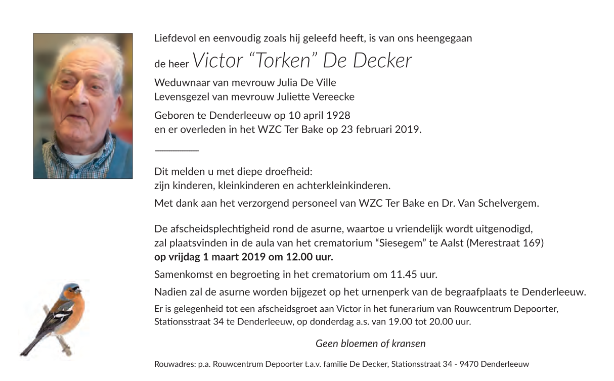Died in Denderleeuw (9470) on 23 February 2019 at the age of 90 years
