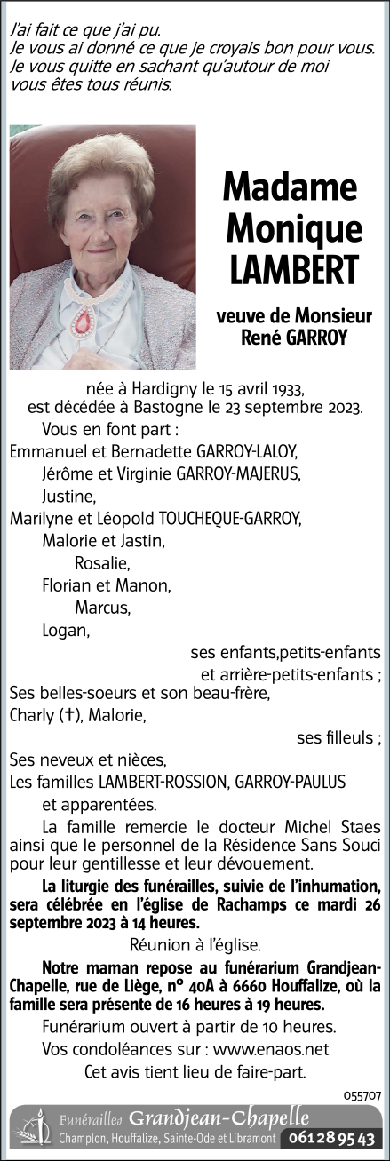 Décédée à Bastogne (6600) le samedi 23 septembre 2023 à l'âge de 90 ans