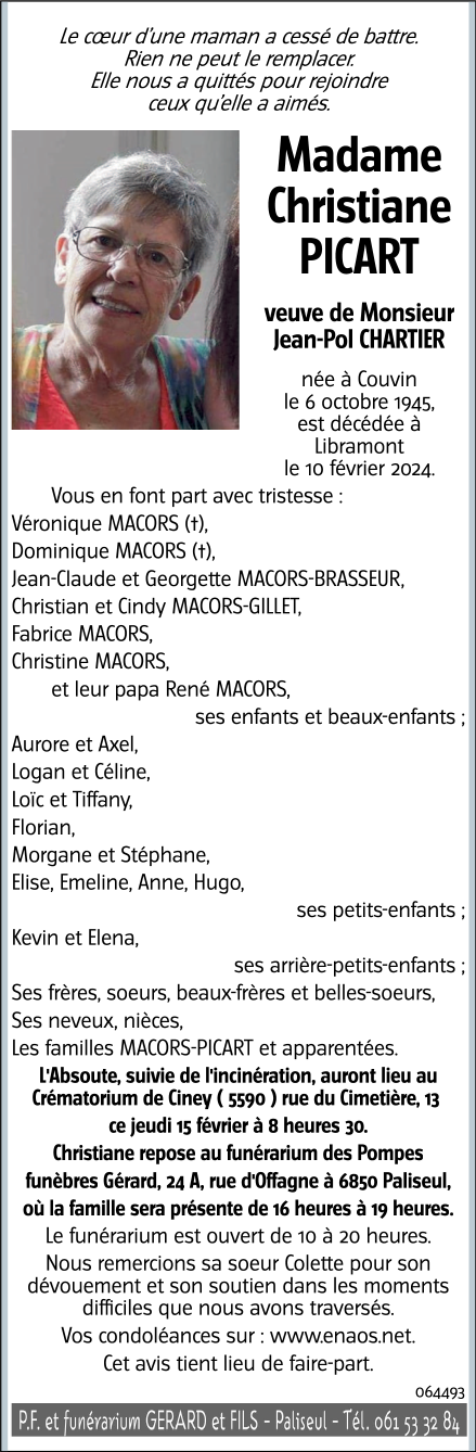 Décédée à Libramont (6800) le samedi 10 février 2024 à l'âge de 78 ans