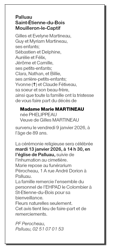 Décédée à Saint-Étienne-du-Bois (85670, France) le vendredi 9 janvier 2026 à l'âge de 89 ans