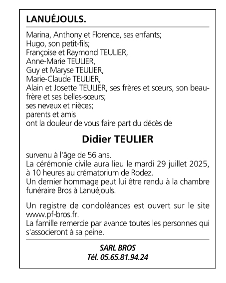 Died in Villefranche-de-Rouergue (12200, France) on 25 July 2025 at the age of 56 years
