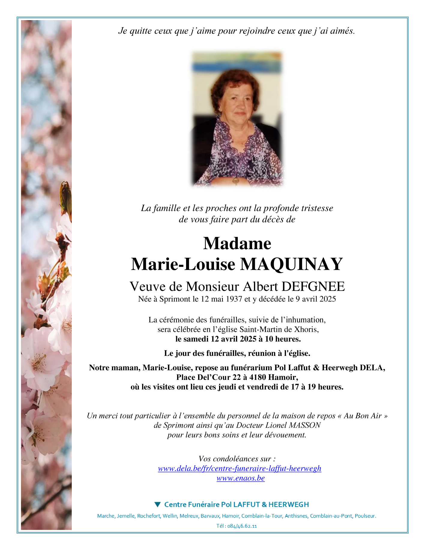 Fallecida en Sprimont (4140) el miércoles, 9 de abril de 2025 a la edad de 87 años