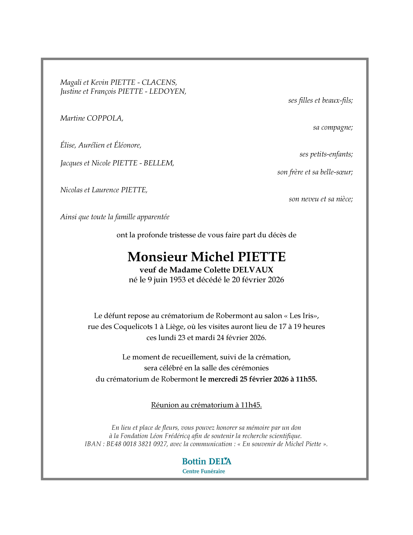 Décédé à Liège (4000) le vendredi 20 février 2026 à l'âge de 72 ans