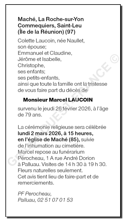Décédé à Mache (85190, France) le jeudi 26 février 2026 à l'âge de 79 ans