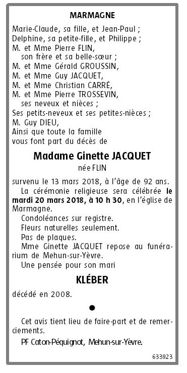 Madame Ginette JACQUET née FLIN
