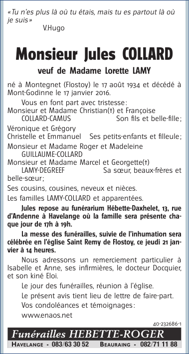 Died in Mont-Godinne (5530) on 17 January 2016 at the age of 81 years