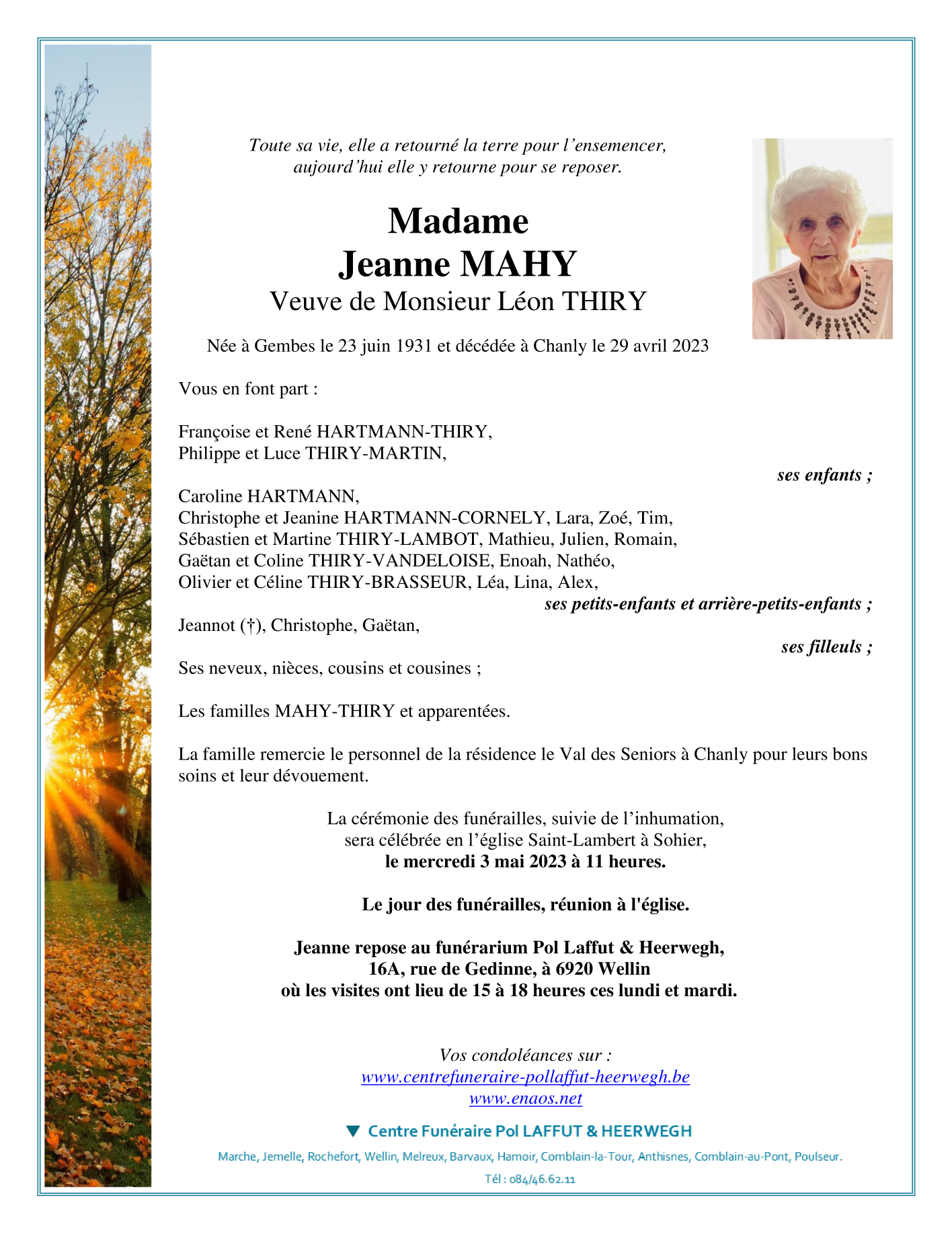 Décédée à Chanly (6921) le samedi 29 avril 2023 à l'âge de 91 ans