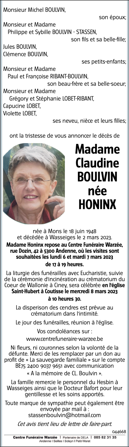 Décédée à Wasseiges (4219) le jeudi 2 mars 2023 à l'âge de 74 ans