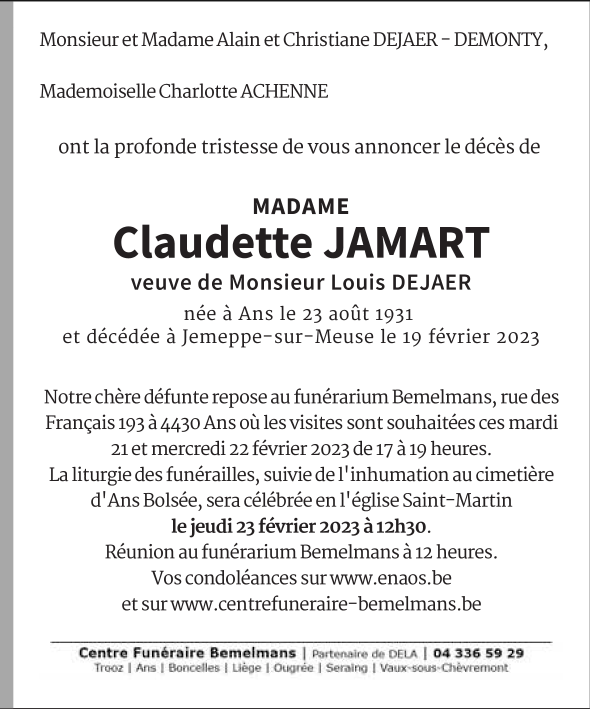 Décédée à Jemeppe-sur-Meuse (4101) le dimanche 19 février 2023 à l'âge de 91 ans