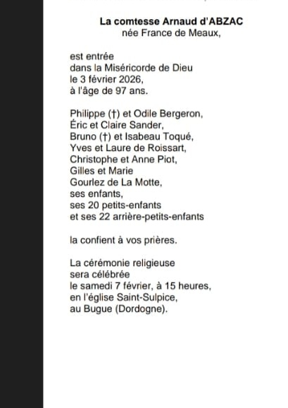 Died in Le Bugue (24260, France) on 03 February 2026 at the age of 97 years