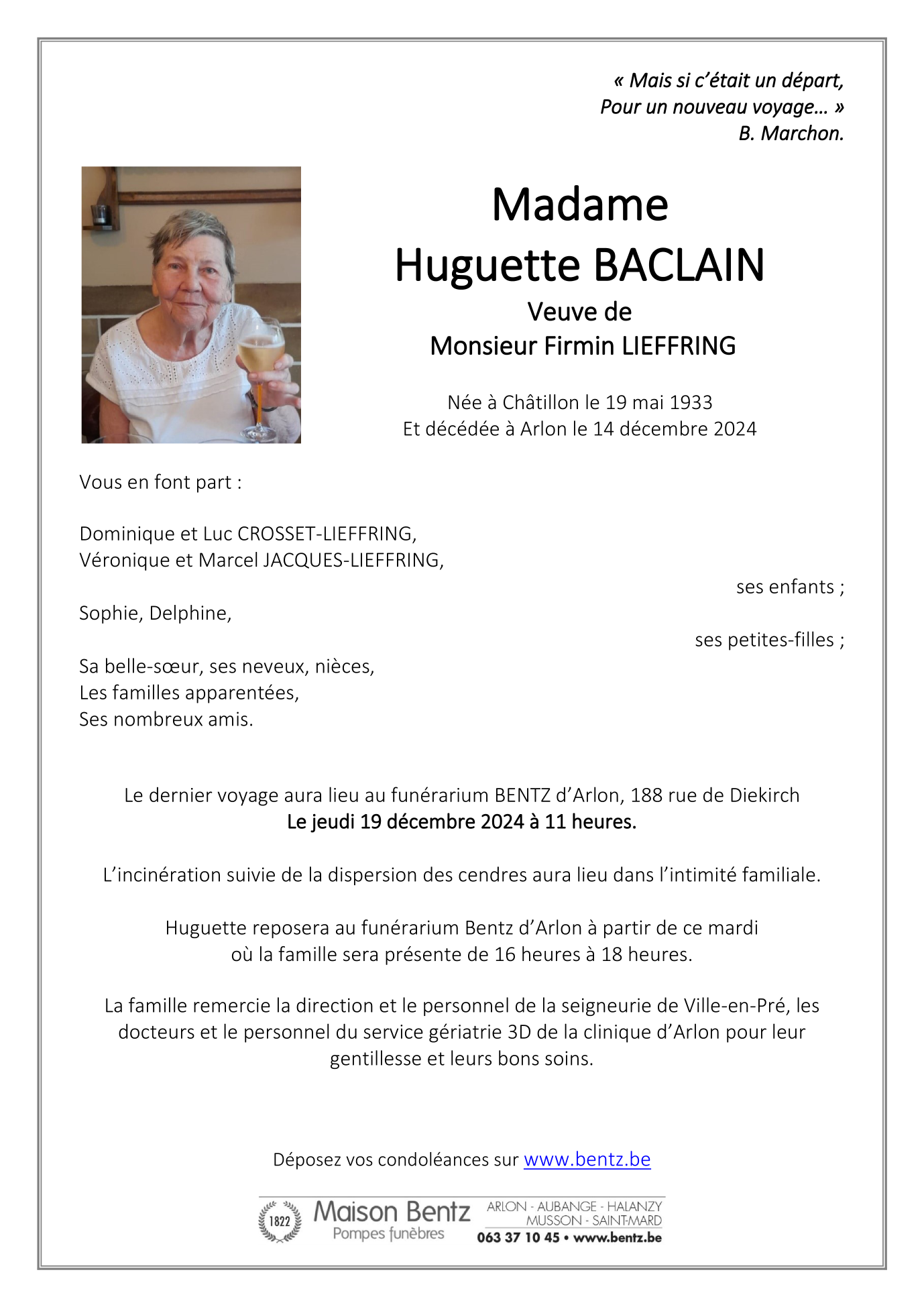 Décédée à Arlon (6700) le samedi 14 décembre 2024 à l'âge de 91 ans