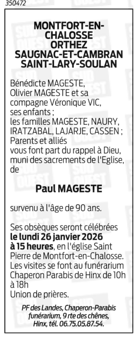 Décédé à Mont-de-Marsan (40000, France) le mardi 20 janvier 2026 à l'âge de 90 ans