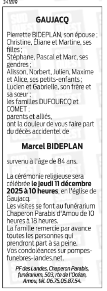 Died in Gaujacq (40330, France) on 08 December 2025 at the age of 84 years