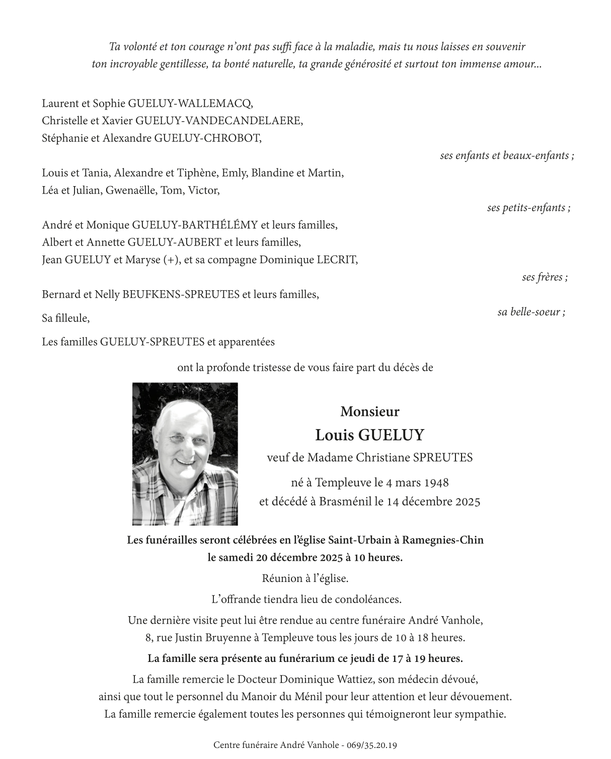 Died in Brasmenil (7604) on 14 December 2025 at the age of 77 years