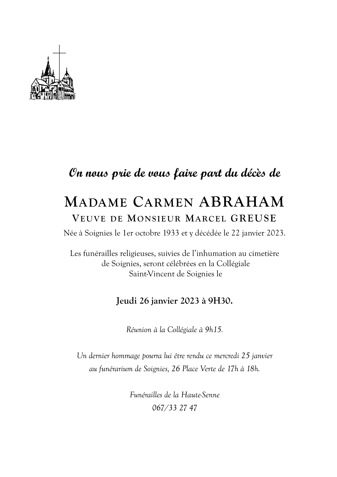 Décédée à Soignies (7060) le dimanche 22 janvier 2023 à l'âge de 89 ans