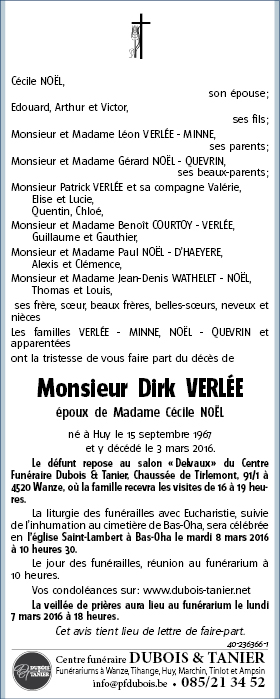Décédé à Huy (4500) le jeudi 3 mars 2016 à l'âge de 48 ans