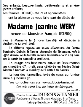 Overleden te Antheit (4520) op donderdag 12 april 2018 op 86-jarige leeftijd
