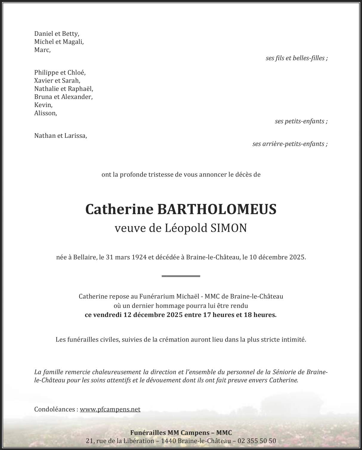 Died in Braine-le-Château (1440) on 10 December 2025 at the age of 101 years
