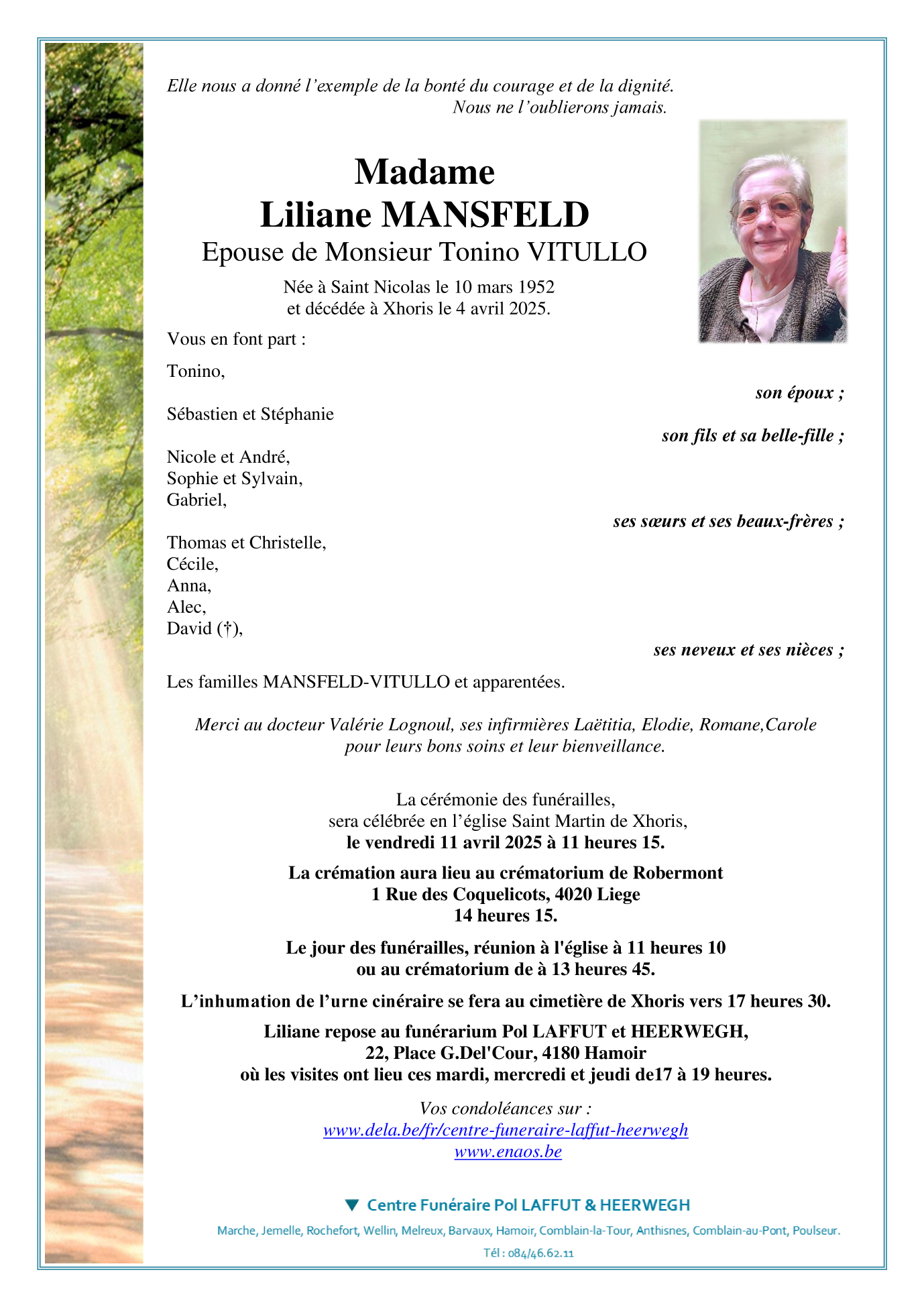 Fallecida en Xhoris (4190) el viernes, 4 de abril de 2025 a la edad de 73 años