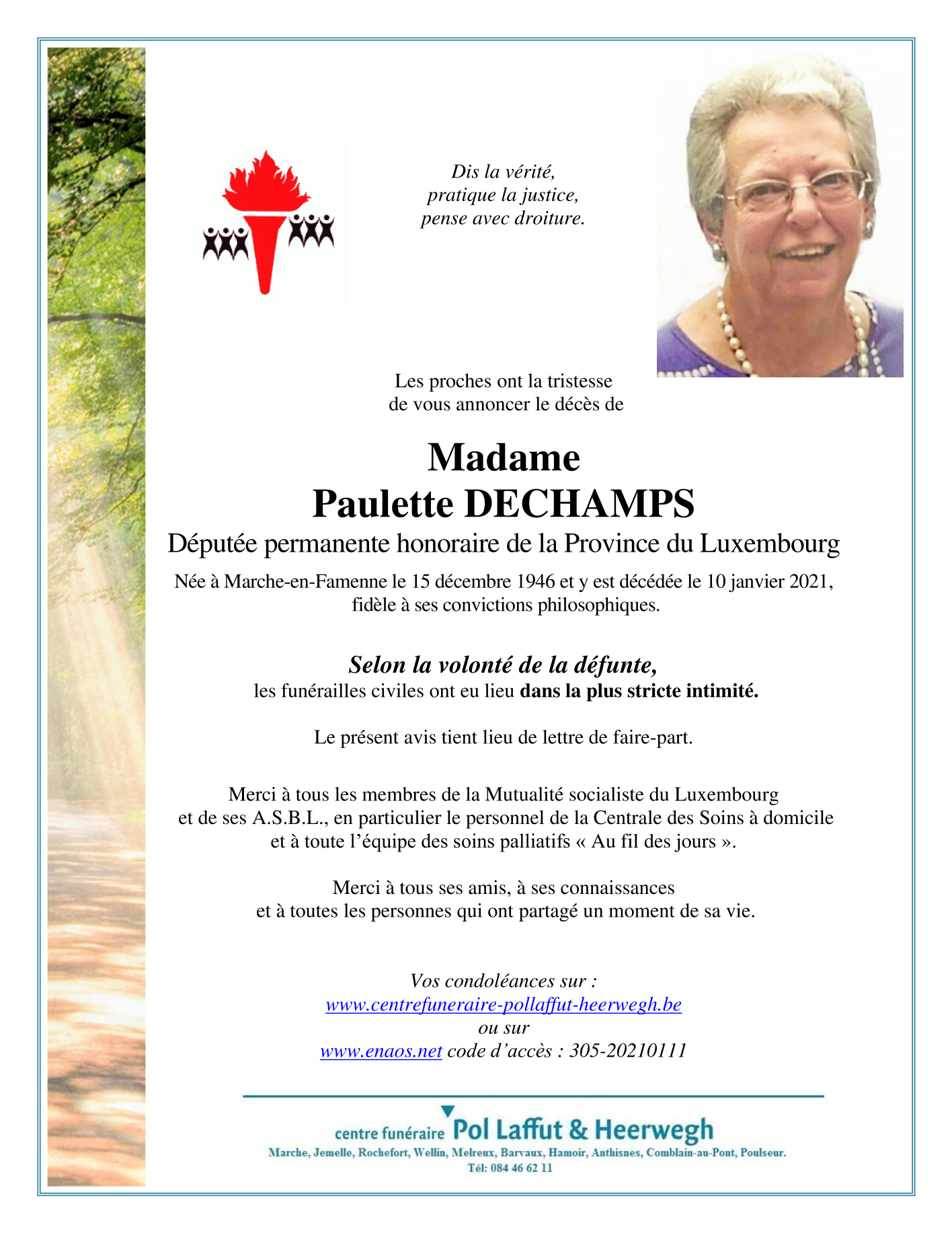 Décédée à Marche-en-Famenne (6900) le dimanche 10 janvier 2021 à l'âge de 74 ans