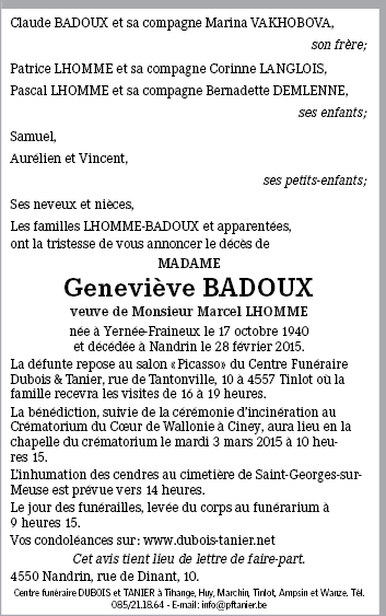 Décédée à Nandrin (4550) le samedi 28 février 2015 à l'âge de 74 ans