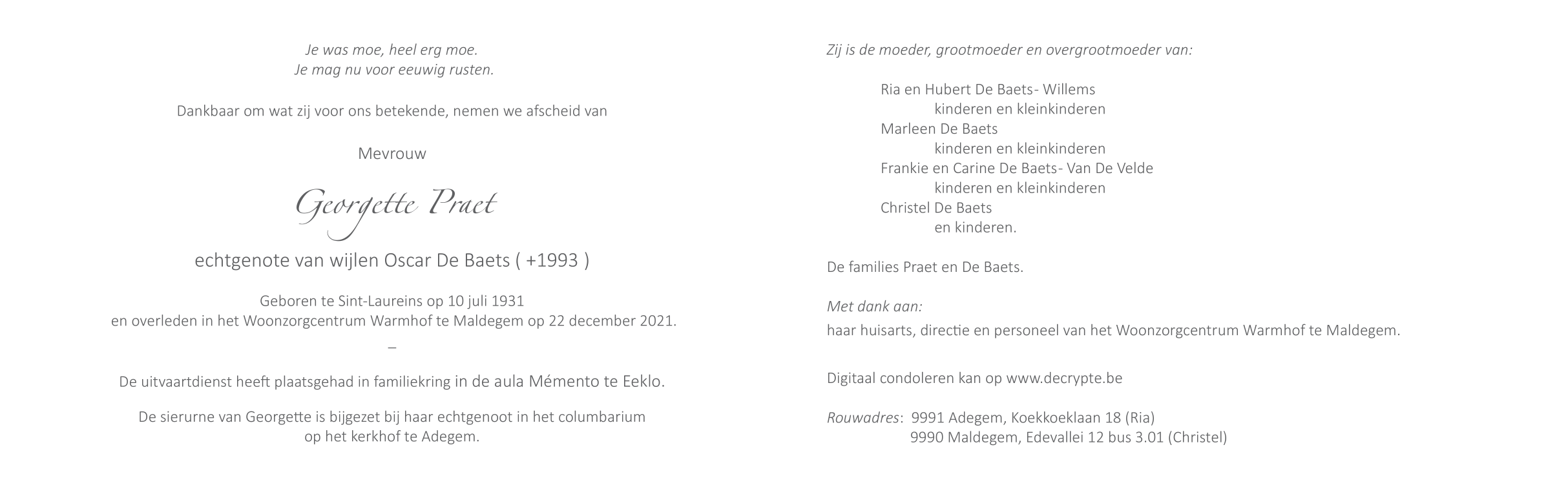 Décédée à Maldegem (9990) le mercredi 22 décembre 2021 à l'âge de 90 ans