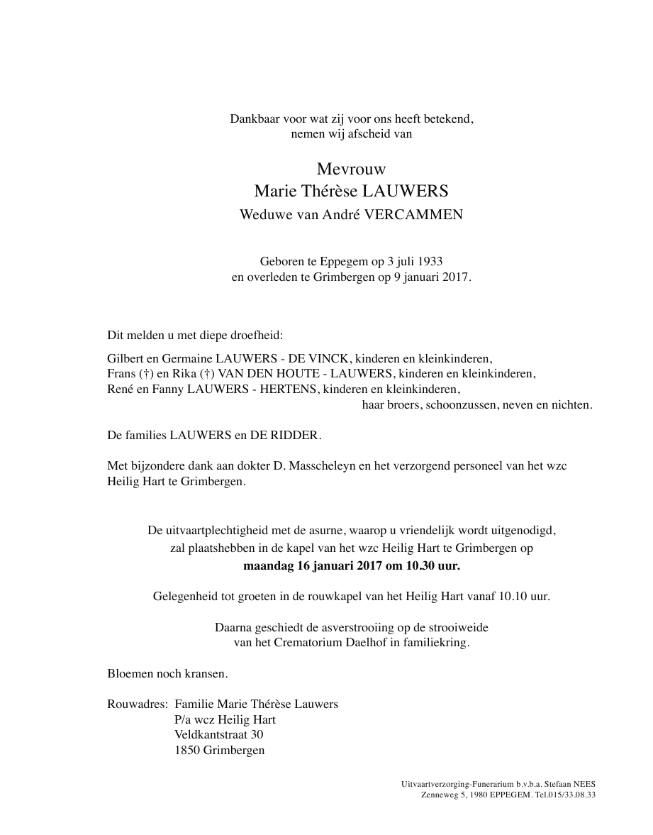 Décédée à Grimbergen (1850) le lundi 9 janvier 2017 à l'âge de 83 ans