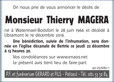 Décédé à Libramont (6800) le mardi 20 décembre 2016 à l'âge de 50 ans