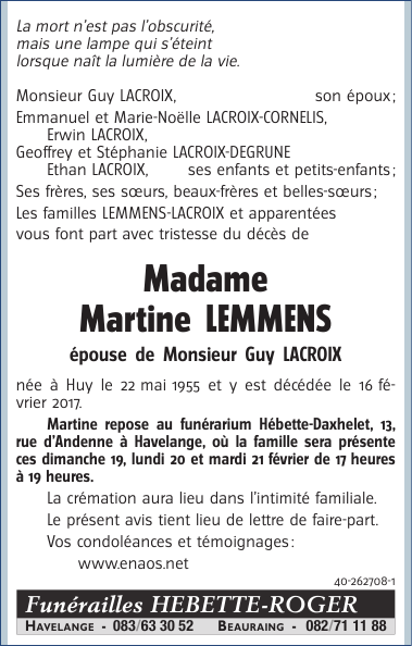 Décédée à Huy (4500) le jeudi 16 février 2017 à l'âge de 61 ans