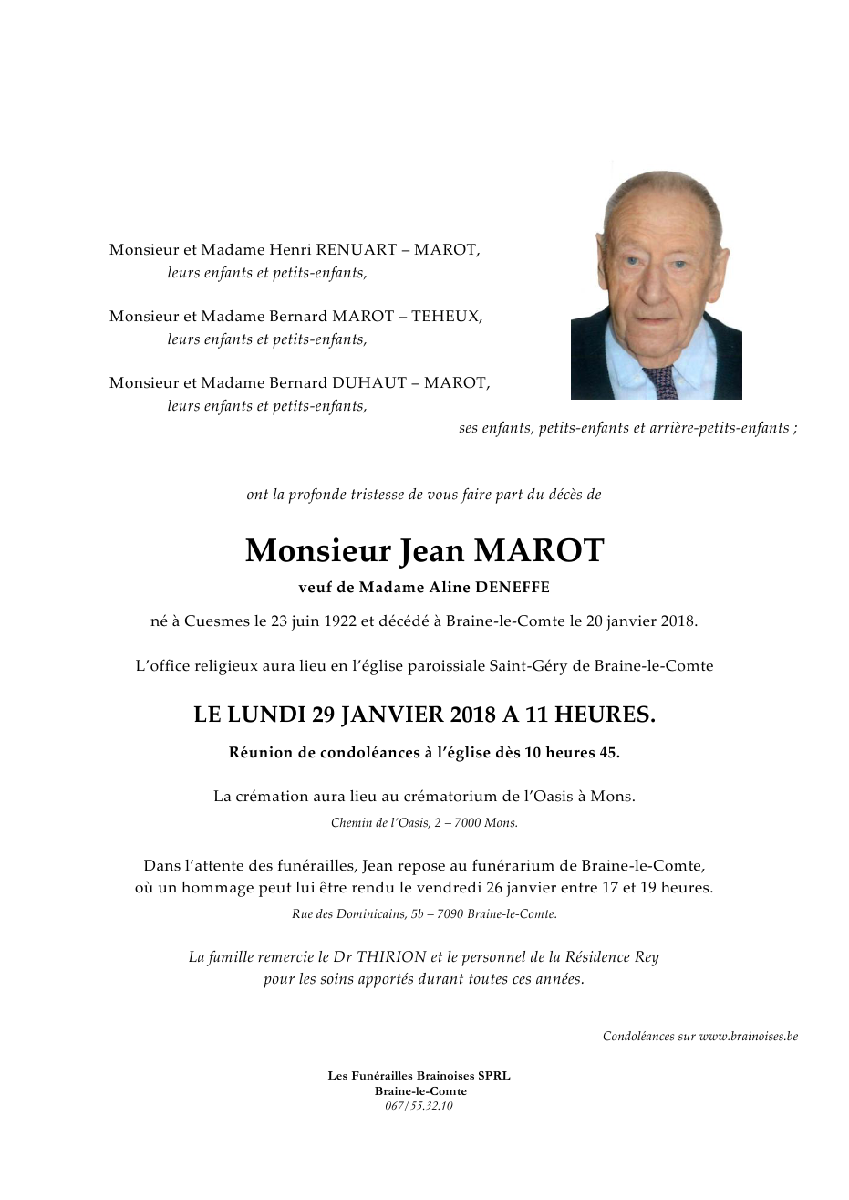Décédé à Braine-le-Comte (7090) le samedi 20 janvier 2018 à l'âge de 95 ans