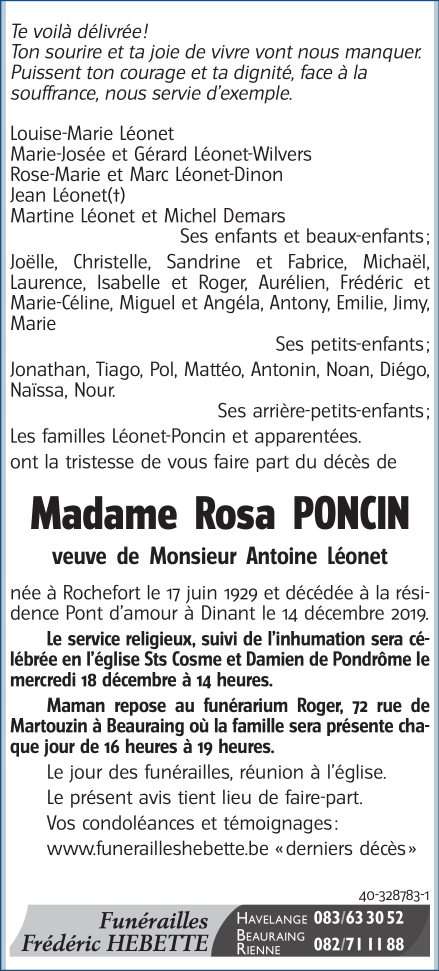 Décédée à Dinant (5500) le samedi 14 décembre 2019 à l'âge de 90 ans