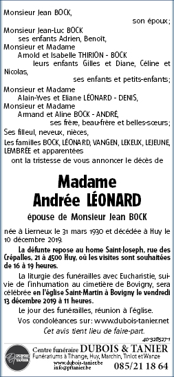 Overleden te Huy (4500) op dinsdag 10 december 2019 op 89-jarige leeftijd