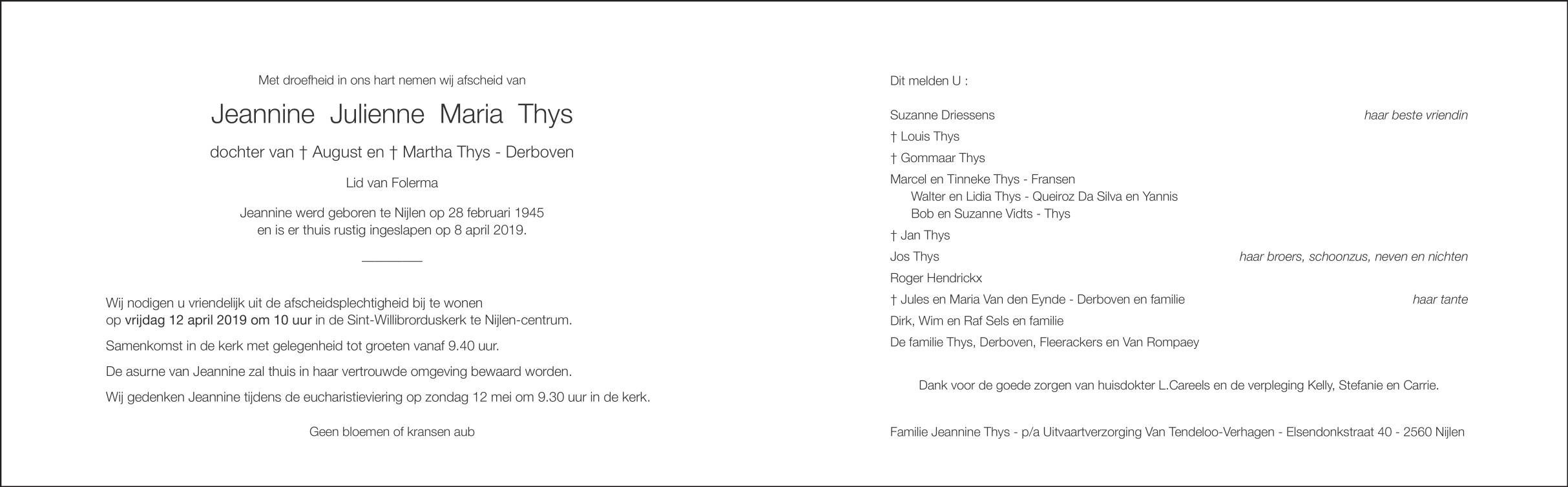 Décédée à Nijlen (2560) le lundi 8 avril 2019 à l'âge de 74 ans