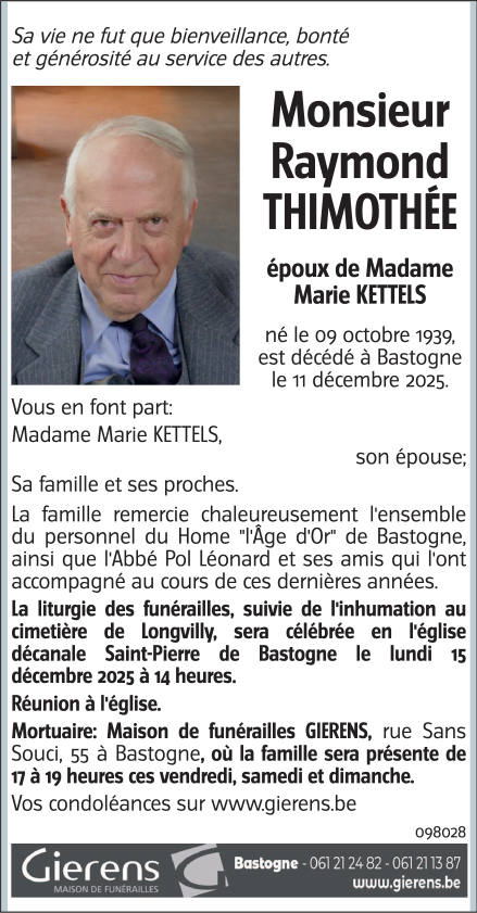 Died in Bastogne (6600) on 11 December 2025 at the age of 86 years